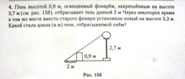 пень высотой 0,9 м, освещаемый фонарем, закрепленным на высоте 2,7 м, отбрасывает тень длинной 2 м. Через некоторое время в том же месте вместо старого фонаря установили новый на высоте 3,3 м. Какой стала длина тени, отбрасываемой пнем?