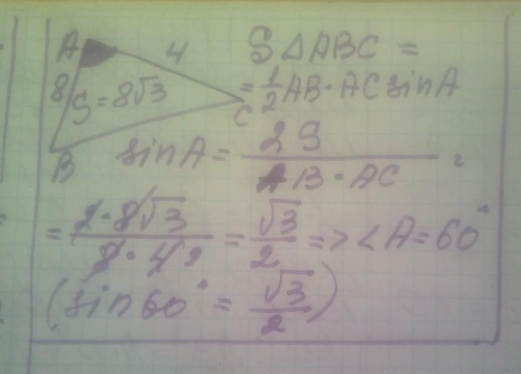 Площадь треугольника АВС равна 8√3 см2. АВ = 8 см, АС = 4 см. Найдите величину угла ВАС