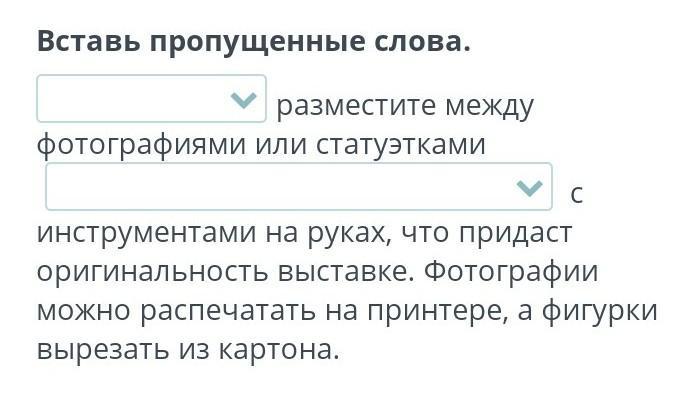 .... разместите между фотографиями или статуэтками...... с инструментами на руках, что придаст оригинальность выставке. Фотографии можно распечатать на принтере, а фигурки вырезать из картона.