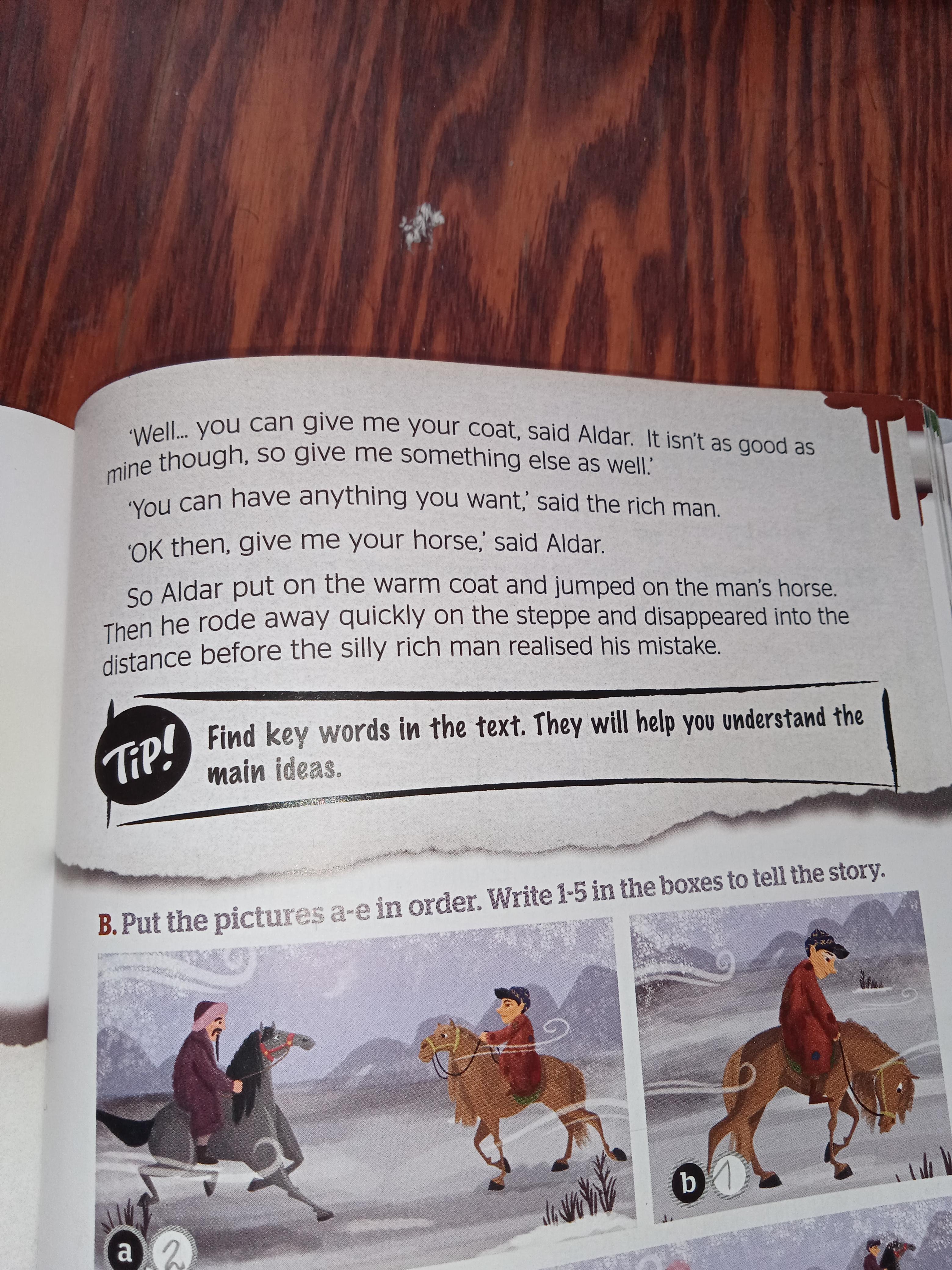 Что ж. Можешь отдать мне пальто, Салд Алдар. Но он не так хорош, как мой, так что дайте мне еще что-нибудь. «Вы можете получить все, что хотите», - сказал богач. Ладно, дай мне свою лошадь, Салд Алдар. Итак, Алдар надел теплую куртку и запрыгнул на лошадь человека. Затем он быстро уехал в степь и исчез вдалеке, прежде чем глупый богач осознал свою ошибку.