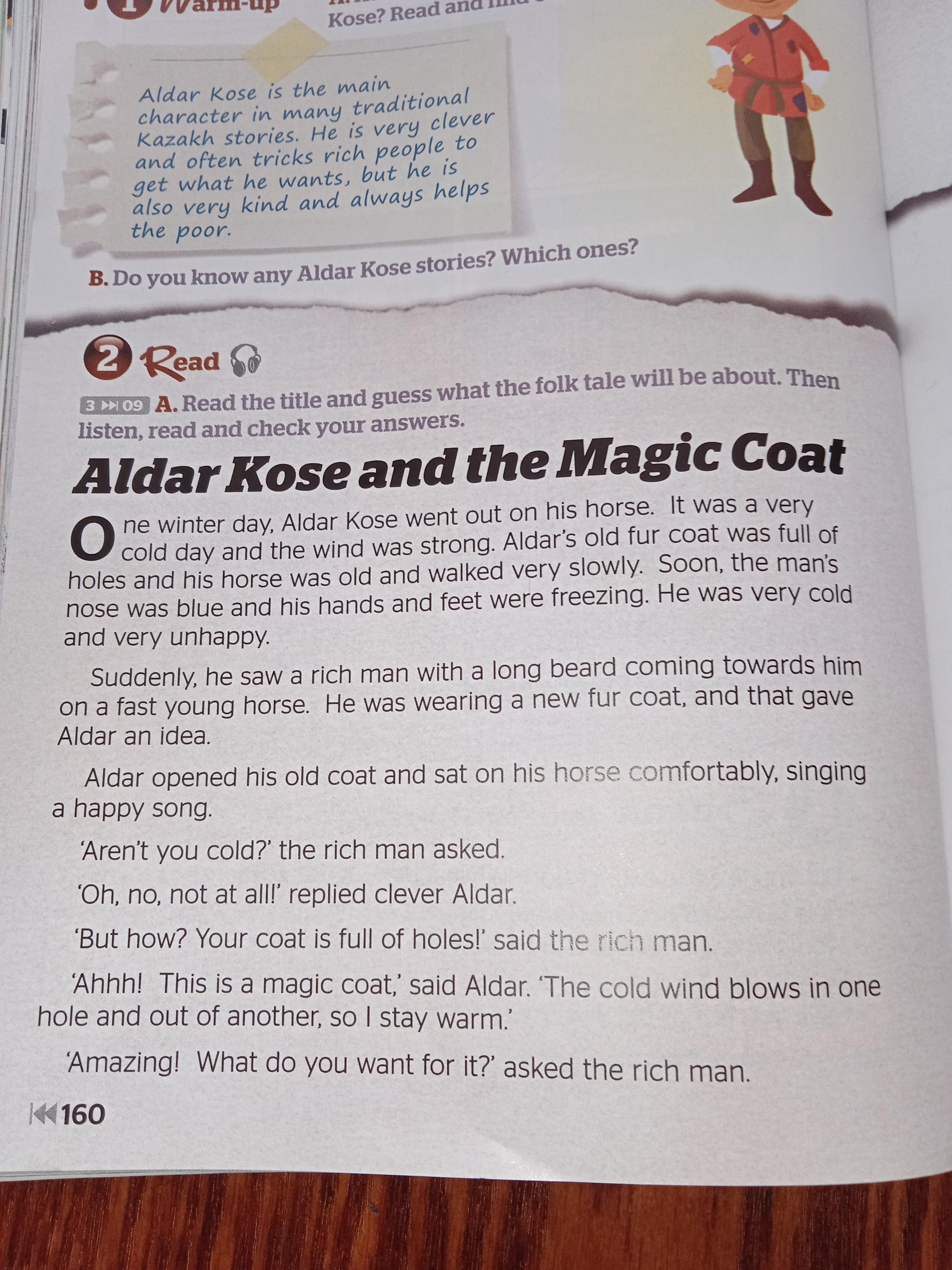 Алдар Косе и Волшебное пальто Зимним днем Алдар Косе выехал на своей лошади. Был очень холодный день и дул сильный ветер. Старая шуба Алдара была дырявой, а его лошадь была старая и шла очень медленно. Вскоре у мужчины посинел нос, а руки и ноги замерзли. Ре было очень холодно и очень недовольно. Вдруг он увидел идущего к нему богатого человека с длинной бородой на быстрой молодой лошади. На нем была новая шуба, и это натолкнуло Алдара на мысль. Алдар расстегнул свое старое пальто и удобно сел на лошадь, напевая веселую песню. «Разве тебе не холодно? - спросил богатый человек. «О, нет, совсем нет, - ответил умный Алдар. - Но как? Твое пальто в дырявых салатах, богатый человек. Аааа! - Это волшебное пальто, - сказал Алдар. Холодный ветер дует в одно отверстие и выходит из другого, так что я остаюсь в тепле. Amazingl Что вы хотите за это? - спросил ручмен.