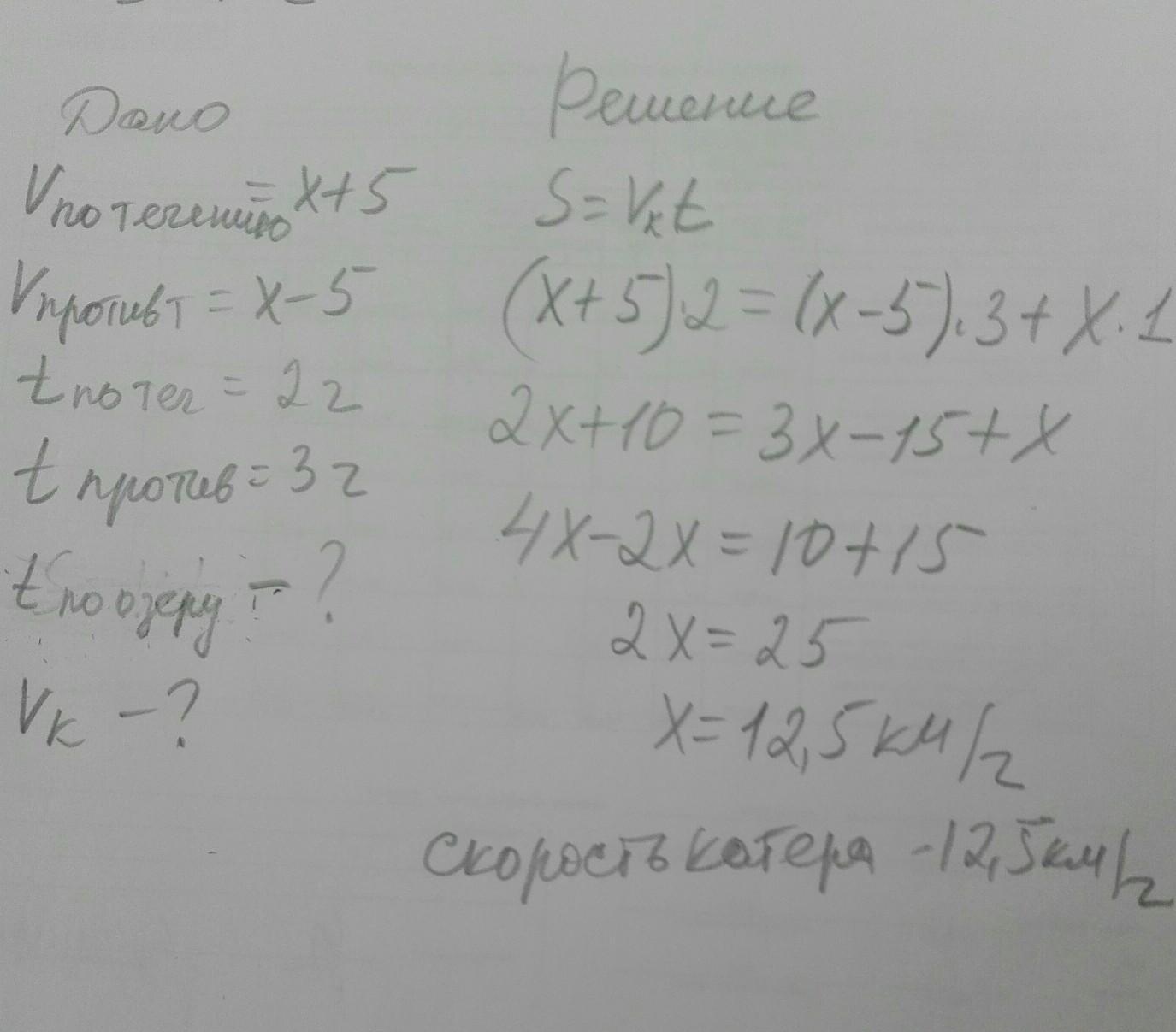Катер за 1 час по озеру и за 3 часа против течения реки проплывая такой же расстояние Что за 2 часа по течению реки Найдите собственную скорость катера если скорость течения реки равна 5 км ч