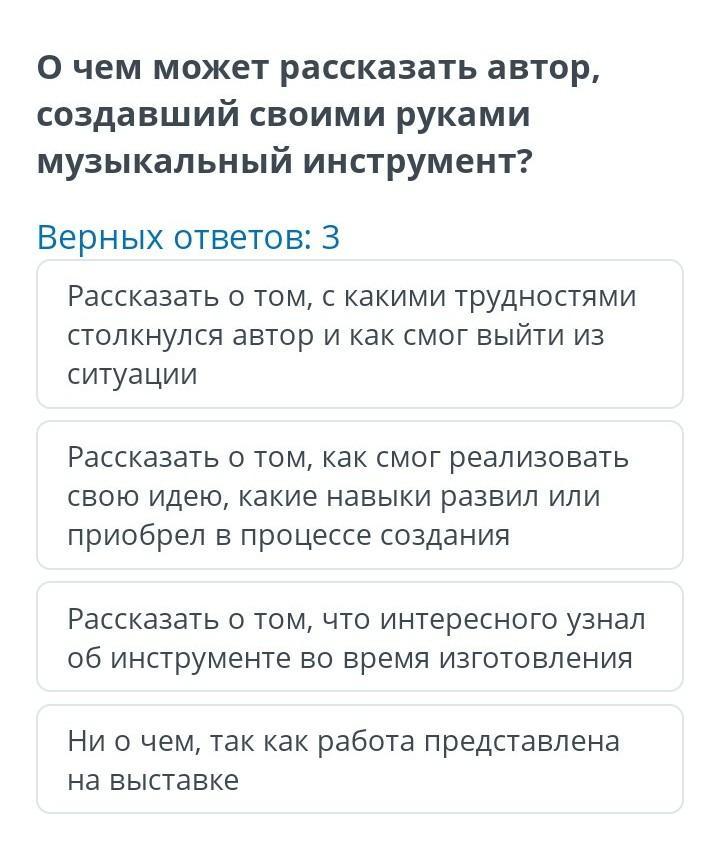 О чем может рассказать автор, создавший своими руками музыкальный инструмент? Верных ответов: 3 Рассказать о том, с какими трудностями столкнулся автор и как смог выйти из ситуации Рассказать о том, как смог реализовать свою идею, какие навыки развил или приобрел в процессе создания Рассказать о том, что интересного узнал об инструменте во время изготовления Ни о чем, так как работа представлена на выставке