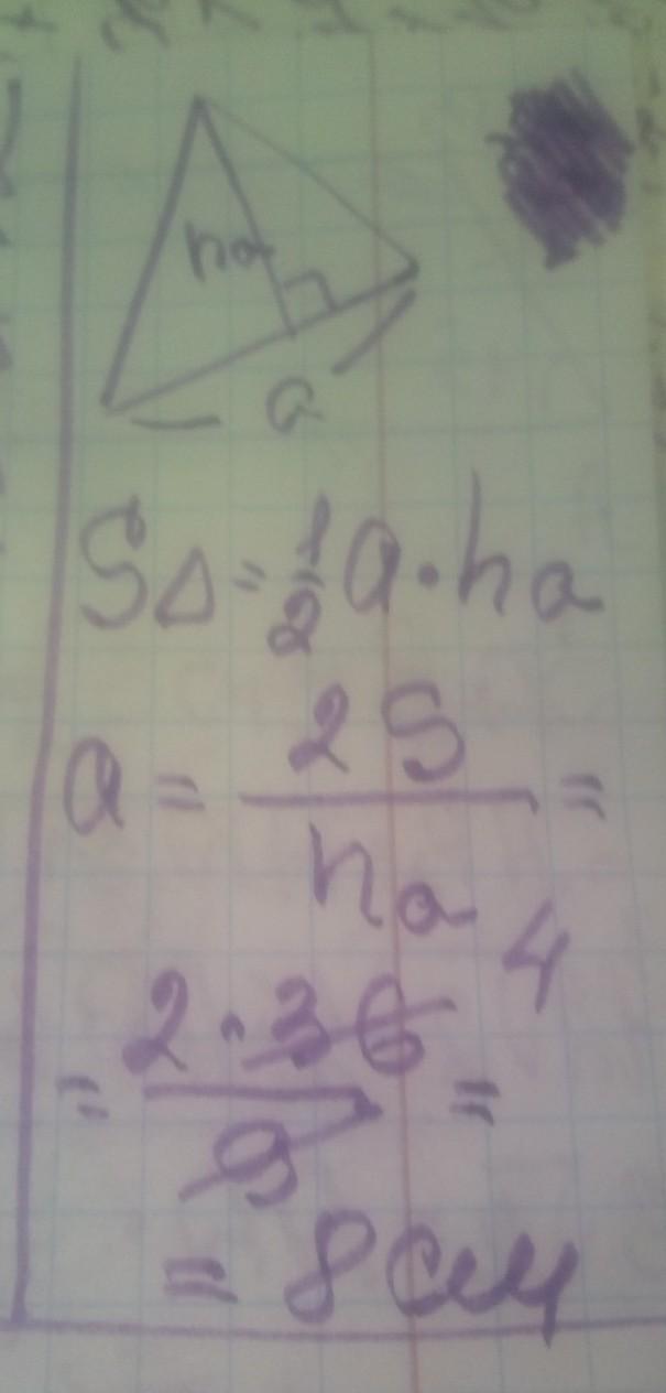 яка площа трикутника дорівнює 36 см в квадраті а його висота 9 см то сторона до якої вона проведена дорівнює ?