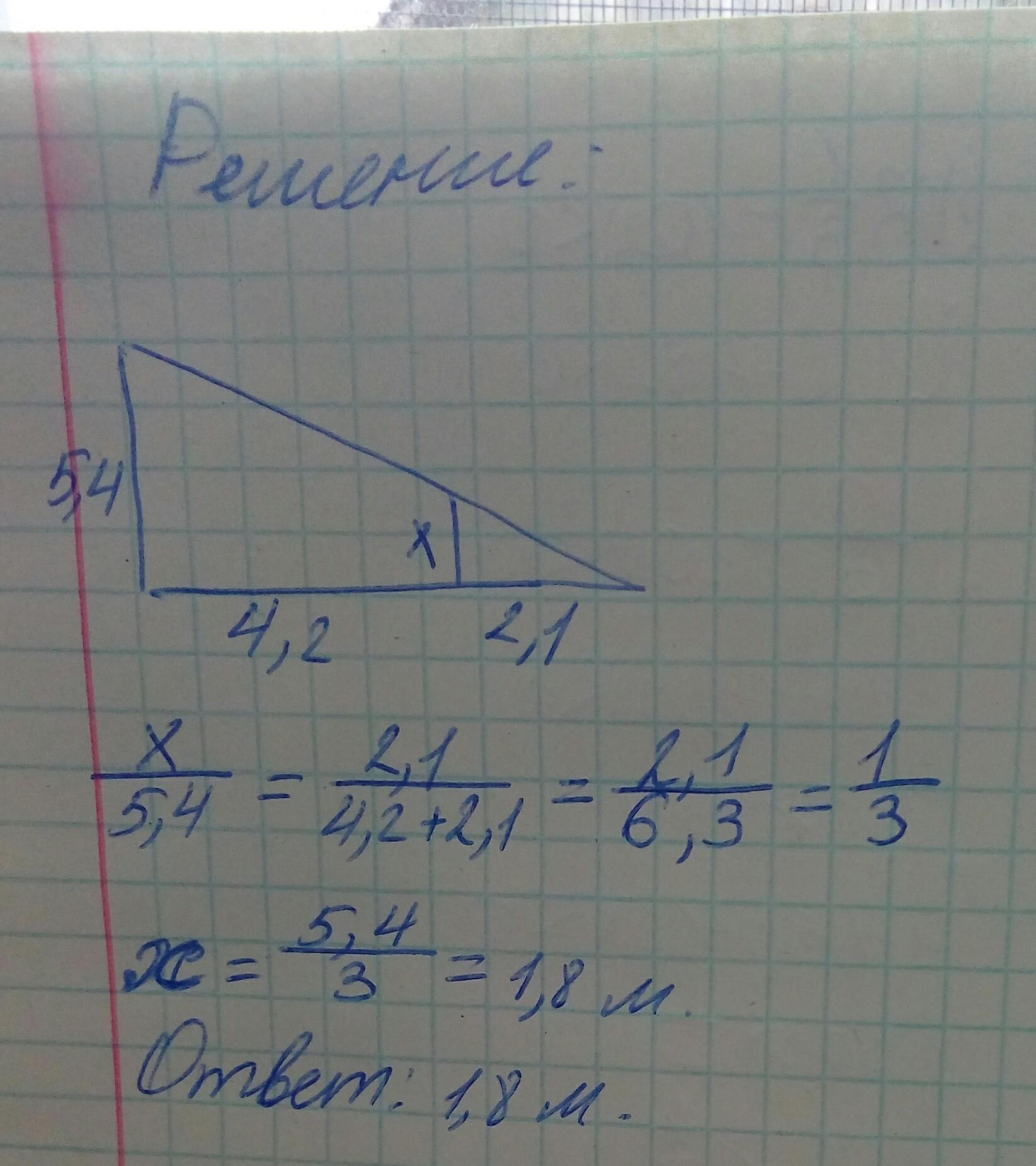1. Фонарь закреплен на столбе на высоте 5 , 4 м. Человек стоит на расстоянии 4 , 4 м от столба и отбрасывает тень длиной 2 , 2 м. Какого роста человек? Ответ дайте в метрах.