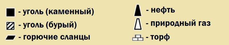 Каким знаком на карте обозначается месторождение угля (бурый и каменный)? Страна-лидер по запасам угля в мире?