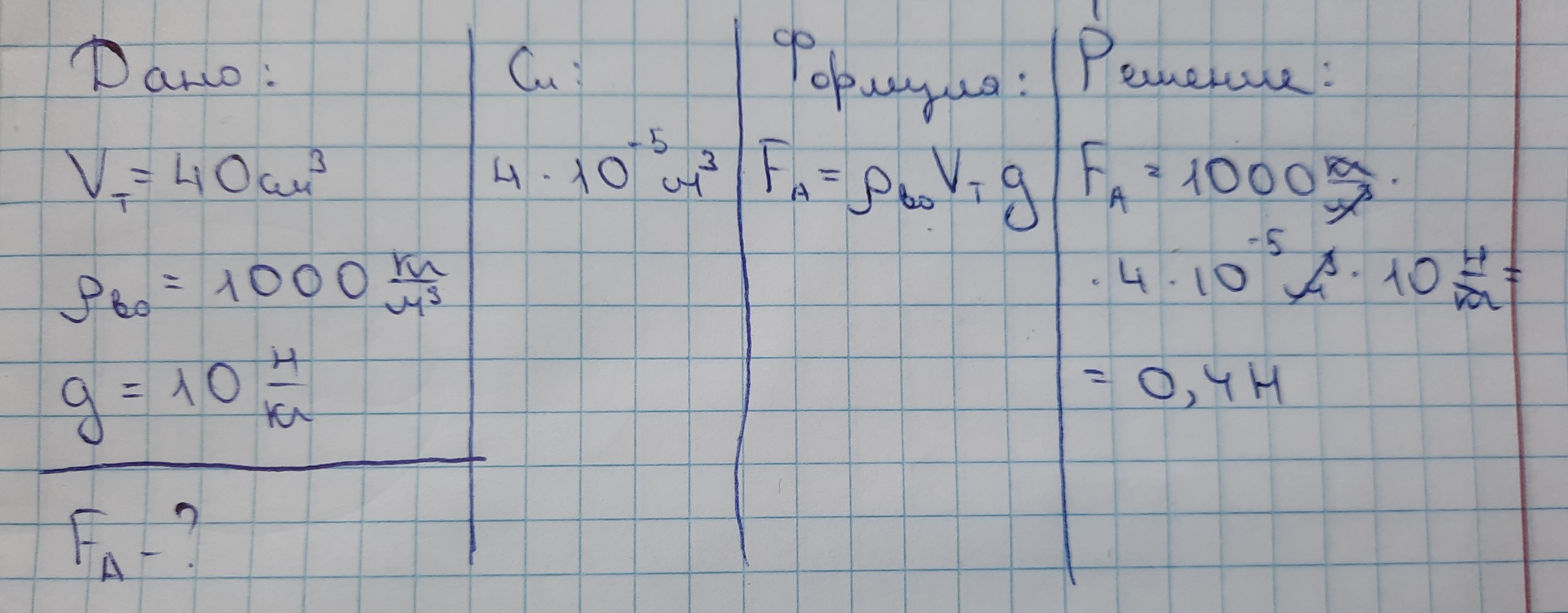5. Вычислите силу Архимеда действующую на тело объемом 40см3. (ρводы = 1000 кг/м3,g = 10Н/кг)