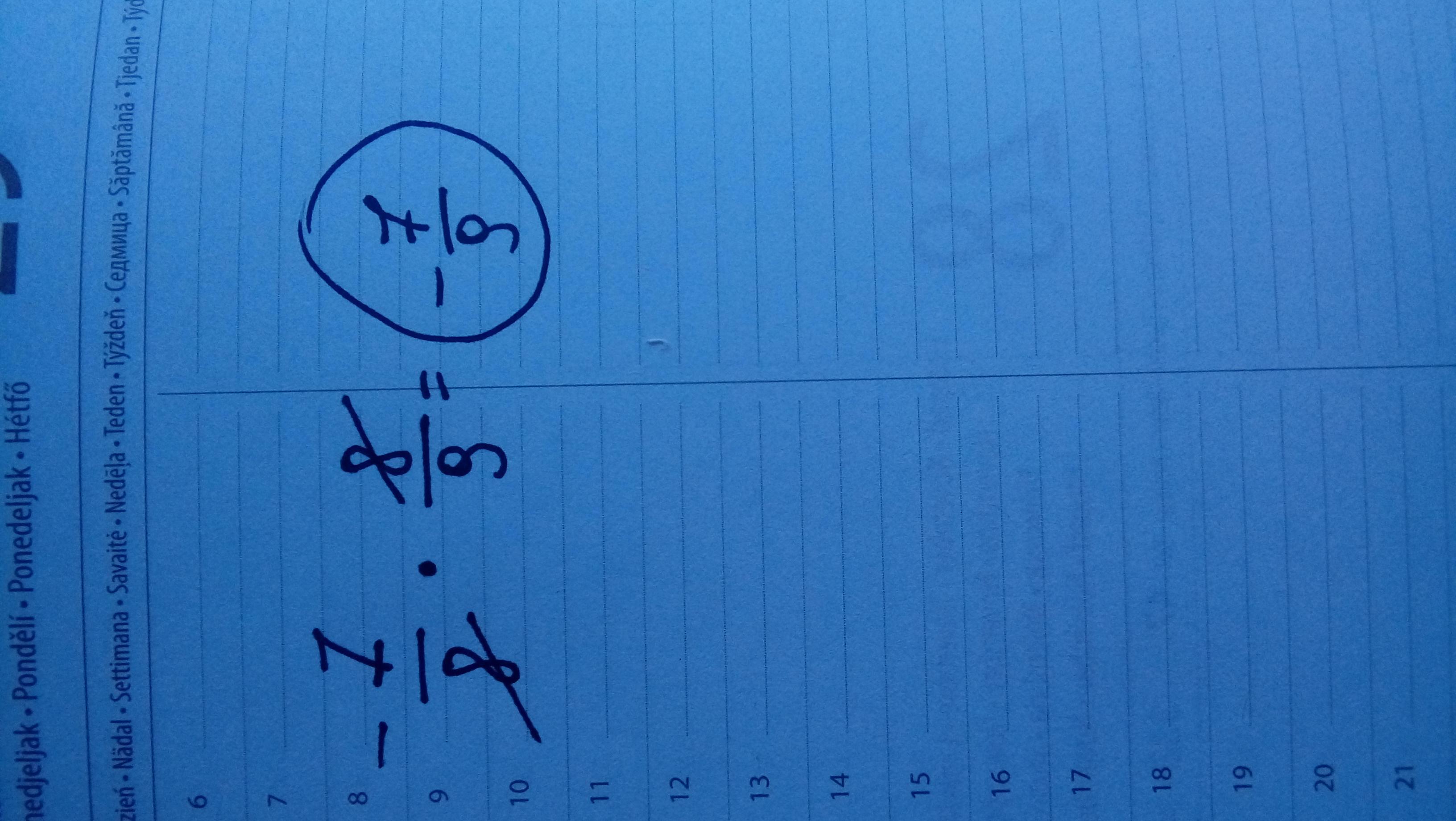 - 7/8 × 8/9 = - 7 × 1/9 = - 7/9