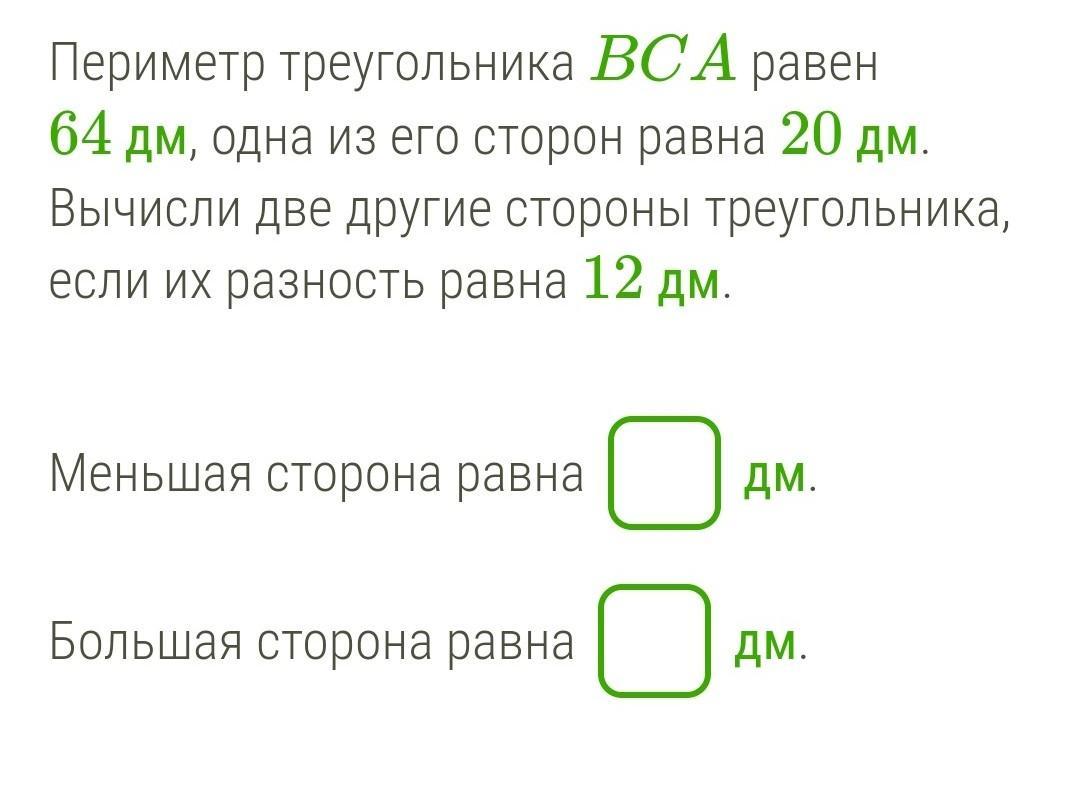 Периметр треугольника BCA равен 64 дм, одна из его сторон равна 20 дм. Вычисли две другие стороны треугольника, если их разность равна 12 дм.