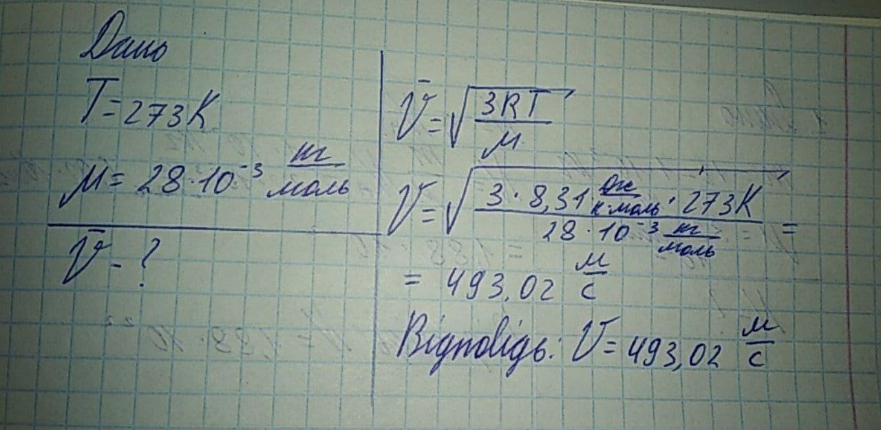 чому рівна швидкість середня квадратична для атомів азоту (м 28*10^-3 кг/моль)? N2 азот. температура азота 273к