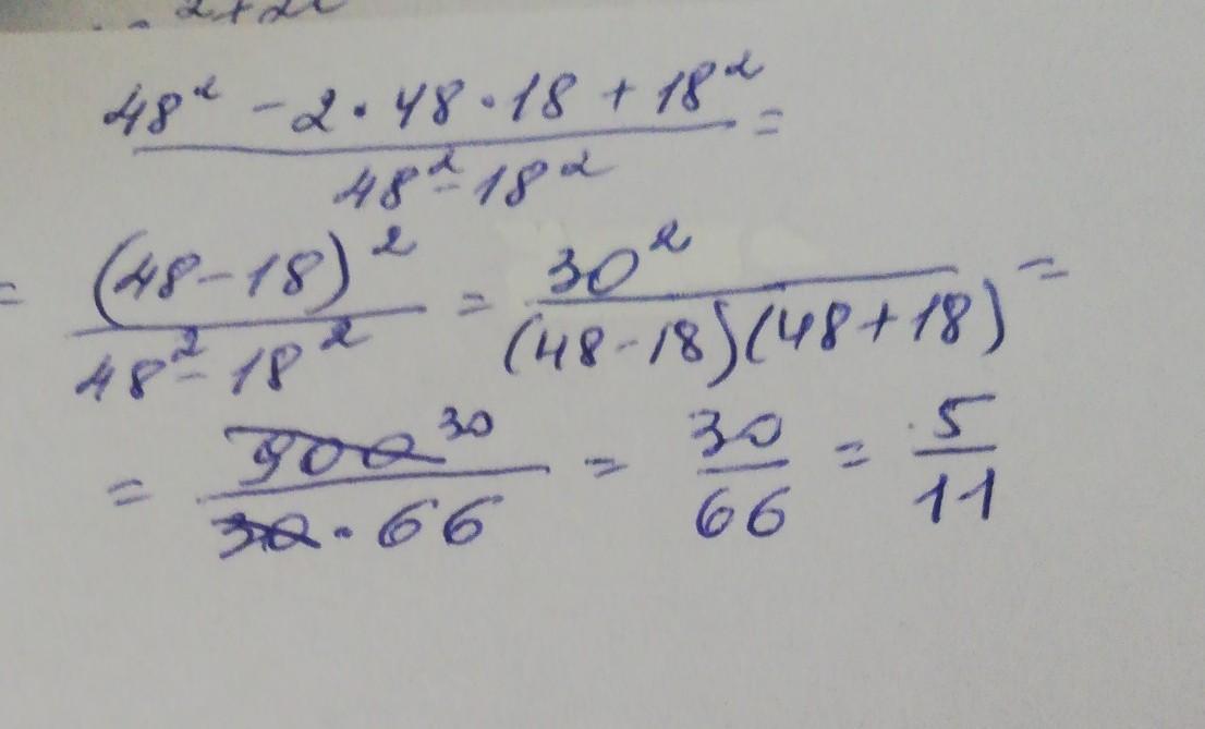48^-2*48*18+18^2 / 48^2-18^2 = (48-18)^2 / (48+18)(48-18) = 48-18 / 48+18 ≈0,45