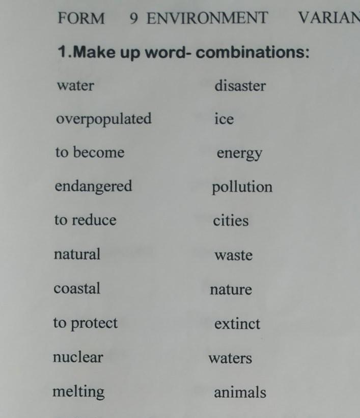 Water pollution, overpopulated cities, to become extinct,to reduce waste,natural disaster, endangered animals, coastal waters,nuclear energy,to protect nature,melting ice