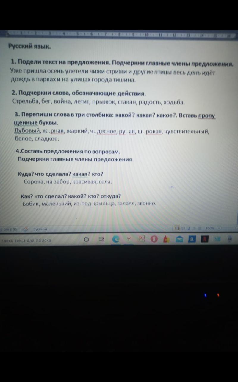 1. Уже пришла осень. Улетели чижи, стрижи и другие птицы. Весь день идёт дождь в парках и на улицах. В городе тишина. В 1 предложении главные члены: Пришла и осень. Во втором предложении: Улетели, чижи, стрижи. В 3 предложении: Идет, дождь. В 4 предложении: вроде нет.