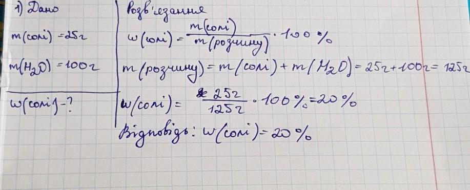 1) 25г солі залили 100г води. Визначіть масову частку солі в утвореному розчині.