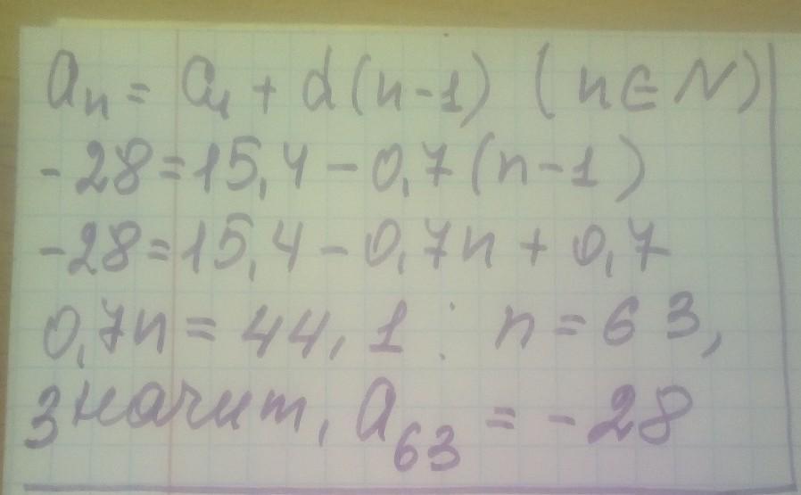 найти номер члена арифметической прогресии an который равен -28 если а1=15,4 d=-0,7​