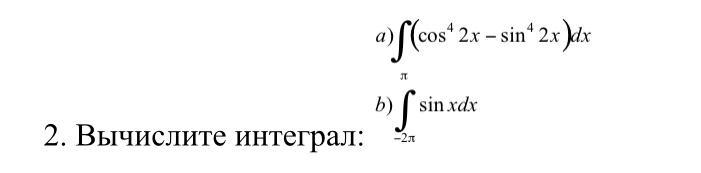 \displaystyle \int\limits^\pi _{-2\pi } {sinx}*dx=-cosx\bigg|^{\pi }_{-2\pi }=-(cos\pi -cos(-2\pi ))=-(-1-1)=2