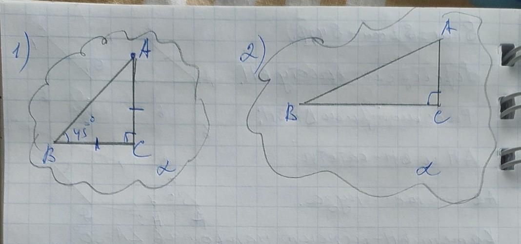 1) позначемо похилу АВ, проекцію ВС, відстань від точки А до площини - АС - отримаємо прямокутний трикутник АВС, в якому ВС і АС - катети, а АВ - гіпотенуза. Якщо ВС=АС, тоді отриманий трикутник АВС - рівнобедренний, тому його кути при основі АВ - рівні. Так як сума гострих кутів прямокутного трикутника дорівнює 90°, тоді кутА=кутВ=90÷2=45°