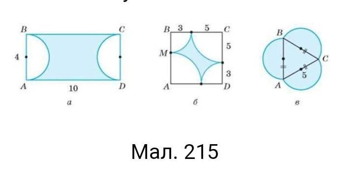Знайдіть довжини ліній, які обмежують фігури, зображені на малюнку 215(а,б,в).