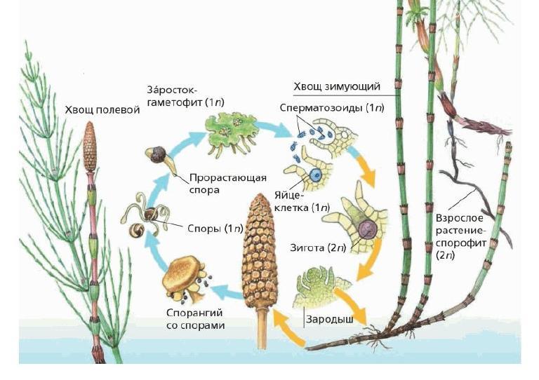 Установите последовательность стадий развития хвоща полевого, начиная с формирования