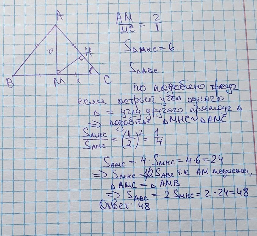 В равнобедренном треугольнике АВС с основанием ВС проведена медиана АМ. Из точки М на сторону АС опущен перпендикуляр МН (Н е AC). Известно, что АМ:МС=2:1 треугольника МНС равна 6. Найдите плошадь треугольника АВС.
