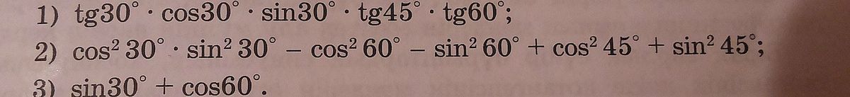 tg30cdot cos30cdot sin30cdot tg45cdot tg60= frac{ sqrt{3} }{3} cdot frac{ sqrt{3} }{2}cdot frac{ 1 }{2}cdot1cdot  sqrt{3} =frac{ 3sqrt{3} }{12} =frac{ sqrt{3} }{4}