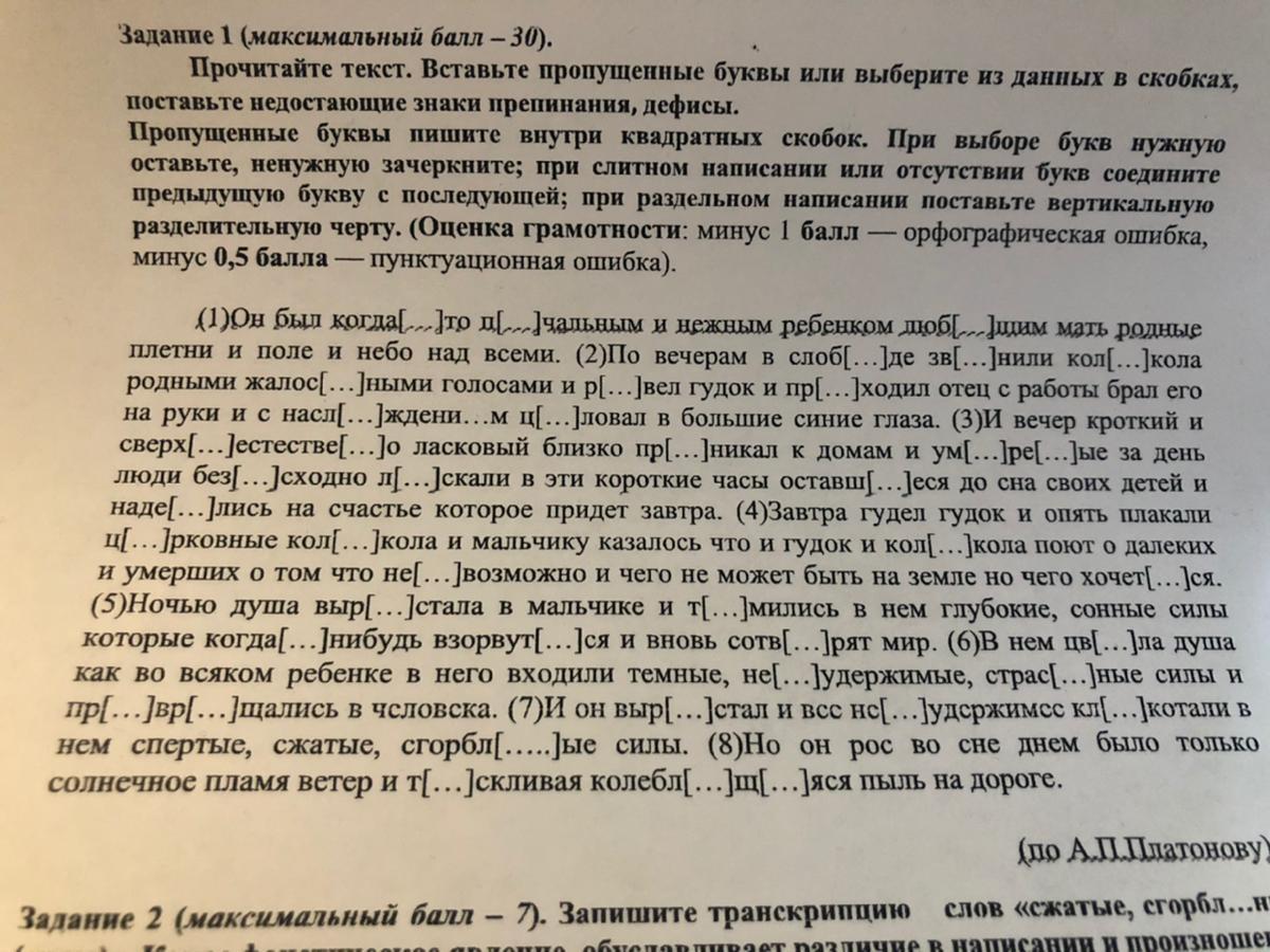 1)он был когда-то печальным и нежным ребенком, любящим мать, родные плетни, и поле, и небо над всеми. 2) по вечерам в слободе звонили колокола родными, жалостными голосами, и ревел гудок, и приходил отец с работы, брал его на руки и с наслаждением целовал в большие синие глаза. 3) и вечер, кроткий и сверхъестественно ласковый, близко проникал к домам, и уморенные за день люди безысходно ласкали в эти короткие часы, оставшиеся до сна, своих детей и надеялись на счастье которое придёт завтра. 4) завтра гудел гудок, и опять плакали церковные колокола, и мальчику казалось, что и гудок и колокола поют о далеких и умерших, о том, что невозможно и чего не может быть на земле, но чего хочется. 5) ночью душа вырастала в мальчике, и томились в нем глубокие, сонные силы, которые когда-нибудь взорвутся и вновь сотворят мир. 6) в нем цвела душа, как во всяком ребенке, в него входили темные, неудержимые, страстные силы и превращались в человека.7) и он вырастал, и все неудержимее в нем клокотали спертые, сжатые, сгорбленные силы. 8) но он рос во сне, днем было только солнечное пламя, ветер и тоскливая, колеблющаяся пыль на дороге.