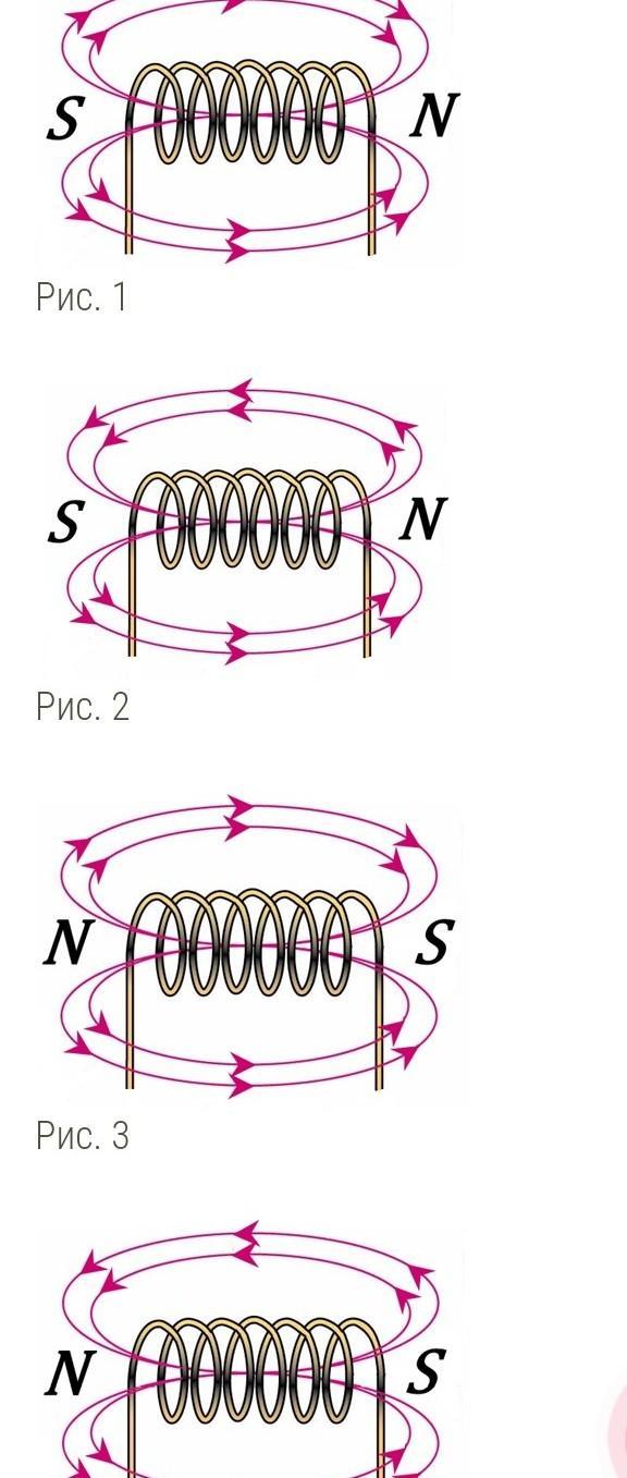 Определи, на каком рисунке направление линий магнитного поля катушки с током указано верно.
