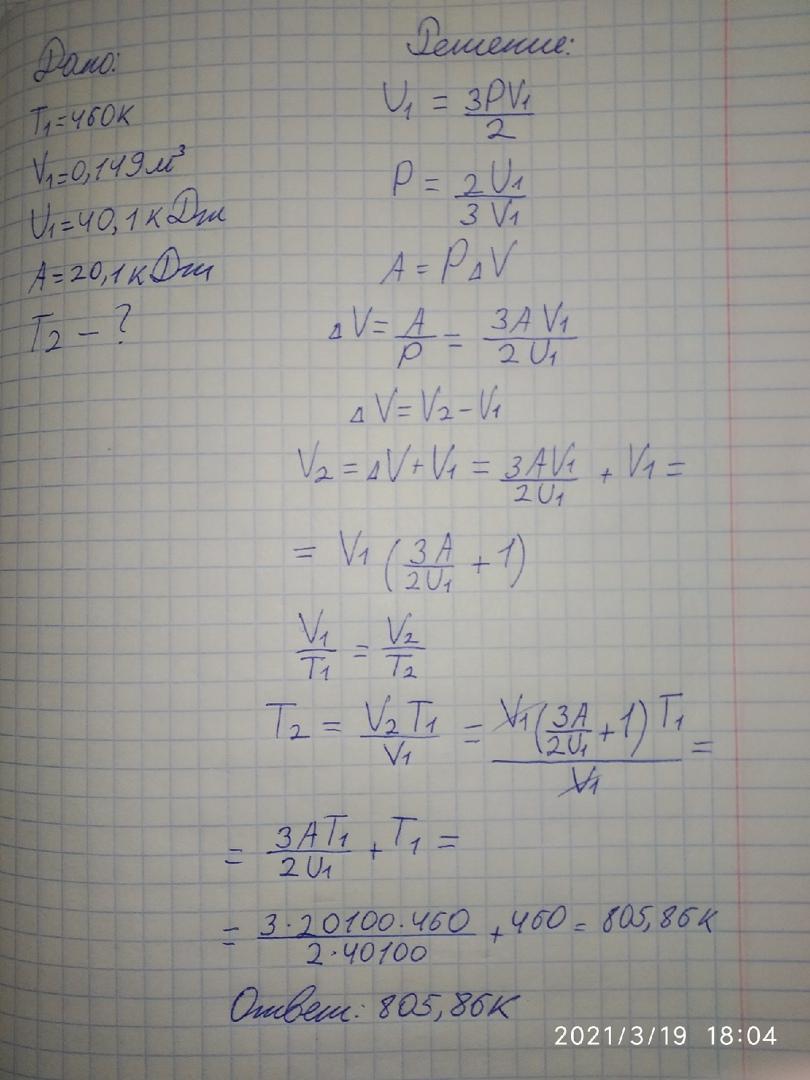 гелий массой m при температуре 460к и давлении p занимает обьем 0,149м^3 внутренняя энергия газа 40,1кдж в изобарическом процессе гаху сообщили количество теплоты Q при этом газом совершена работа 20,1 кдж конечная температура T2