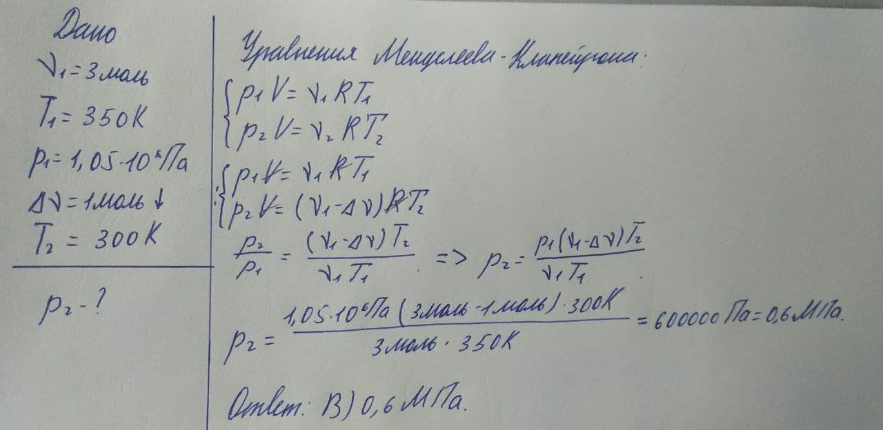 В стальном баллоне находится 3 моль идеального газа при температуре 77 градусов Цельсия и давлению 1,05 МПа. Каким станет давление, если из баллона забрать 1 моль газа, а температура уменьшится до 27 градусов Цельсия.