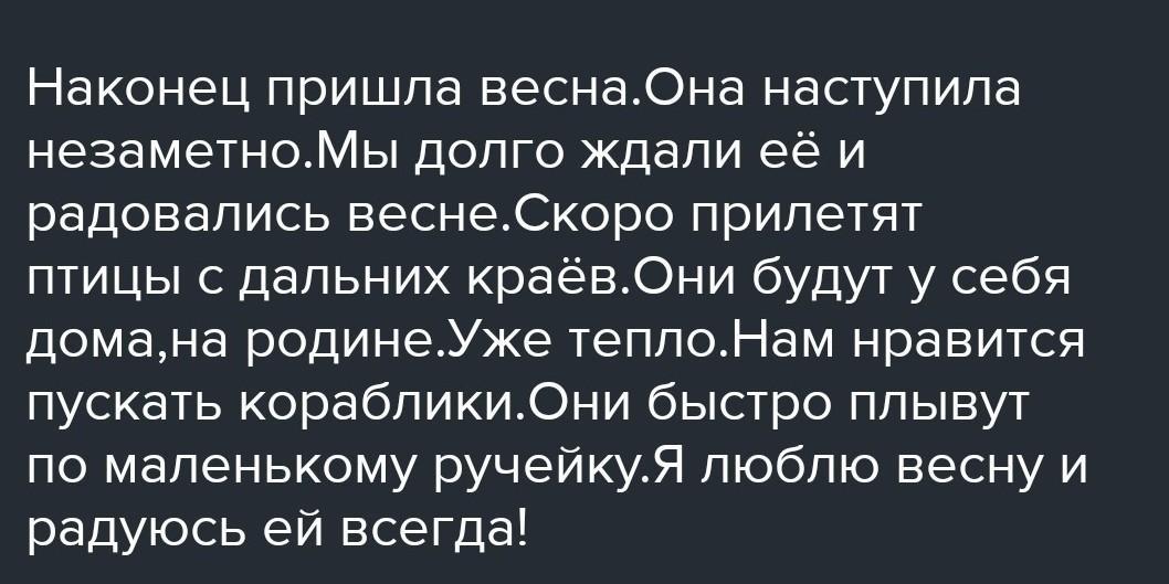 Мы долго ее ждали.И это самый прекрасный период,когда тает снег и лёд,и наступает долгожданная Весна.Этот период когда птицы возвращаются на родину,и на улице становится теплее. Никто не отрицает что это самое нежное время года.Некоторым моим одноклассникам не нравится весна.