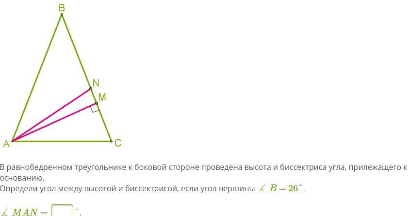 Определи угол между высотой и биссектрисой, если угол вершины ∡ B = 26°.