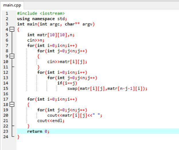 Дан квадратный массив. Поменяйте местами в каждом столбце элементы, стоящие на главной и побочной диагонали.