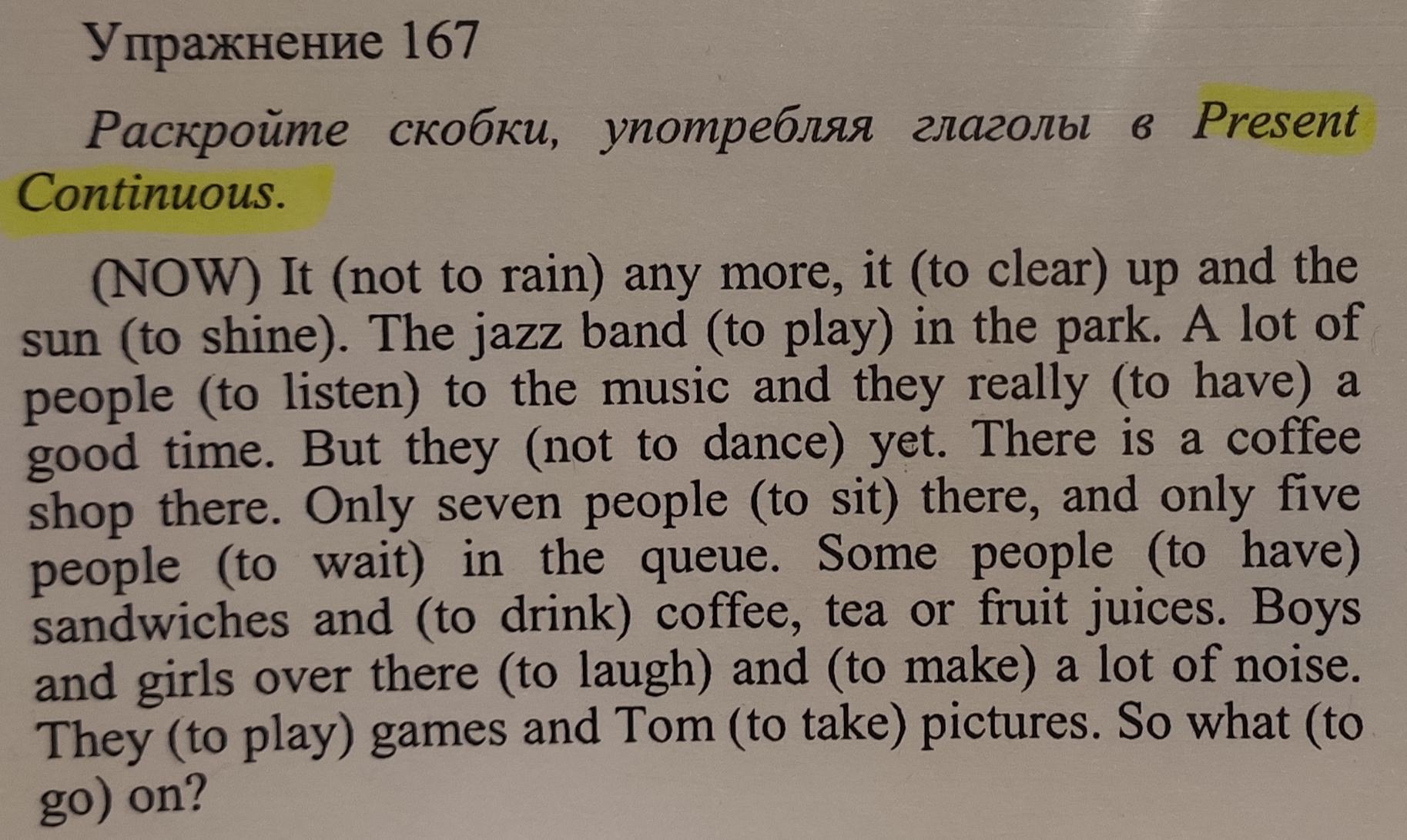 isn't raining,is clearing,is shining,is playing,are listening,are having,isn't dancing,are sitting,are waiting,are having,are drinking,are laughing,are making,are playing,are taking,is going