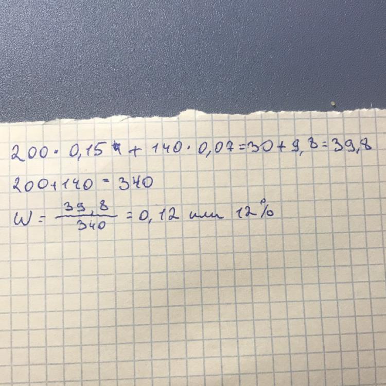 Смешали 200 г 15%-го раствора соли и 140 г 7%-го раствора этой же соли. Вычислите массу воды в полученном растворе (в г).