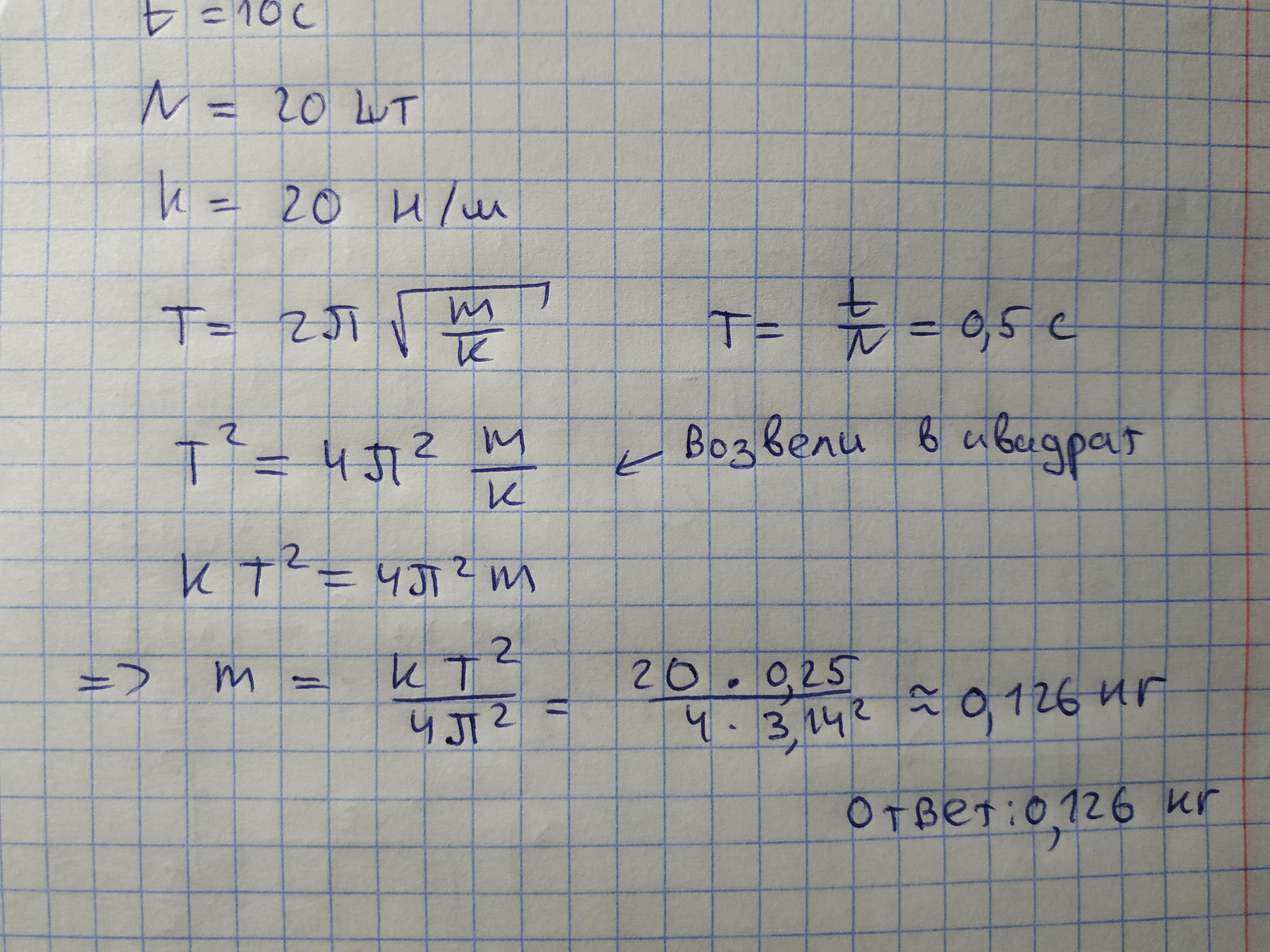 2. Найти массу груза, подвешенного к пружине, если он за 10 секунд совершает 20 колебаний. Жесткость пружины 20 нм.