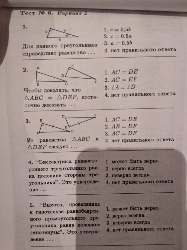 5. Верно всегда. Высота явл. медианой. Середина гипотенузы-центр описанной окружности, Эта высота-радиус