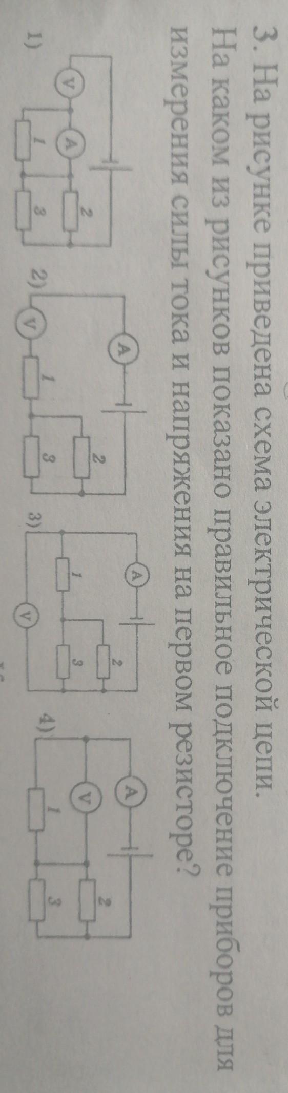 На каком из рисунков показано правильное подключение приборов для измерения силы тока и напряжения на первом резисторе?
