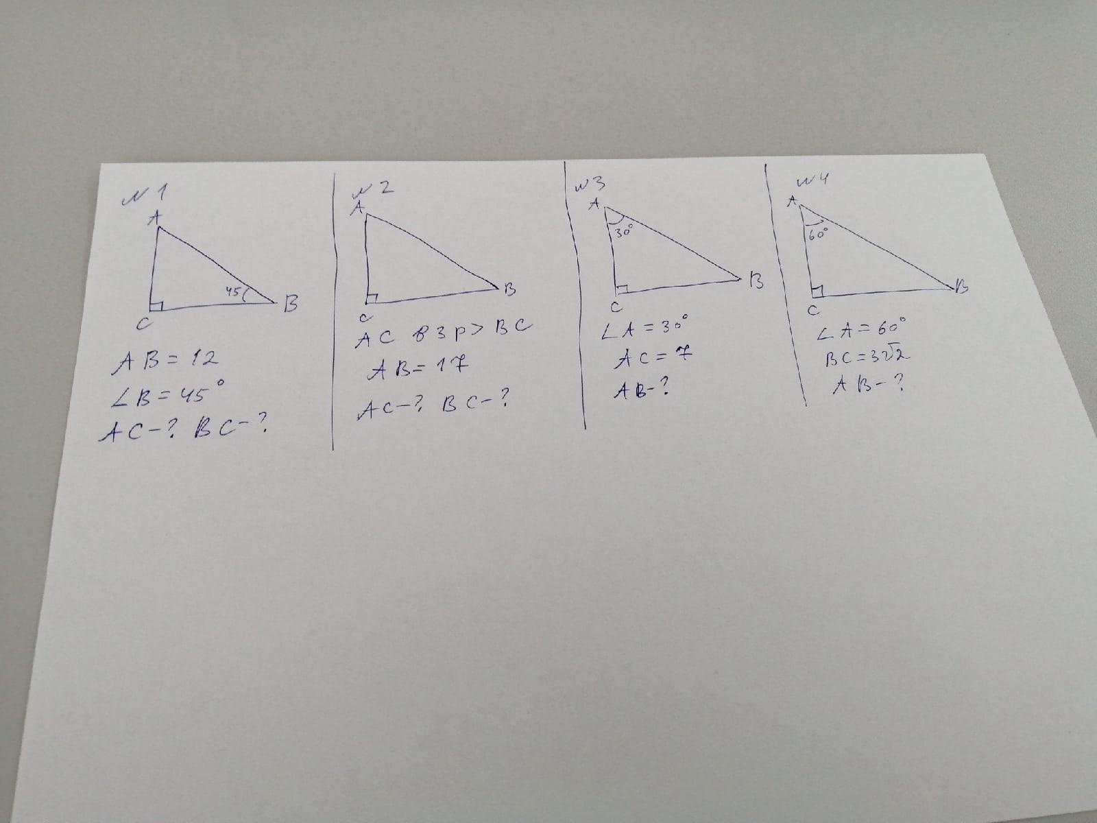 1)\ \ AB=12\ ,\ \ \angle B=45^\circ \\\\\dfrac{AC}{AB}=sin45^\circ \ \ \ \to \ \ \ AC=AB\cdot sin45^\circ =12\cdot \dfrac{\sqrt2}{2}=6\sqrt2\\\\\\\dfrac{BC}{AB}=cos45^\circ \ \ \ \to \ \ \ BC=AB\cdot cos45^\circ =12\cdot \dfrac{\sqrt2}{2}=6\sqrt2\\\\\\AC=BC