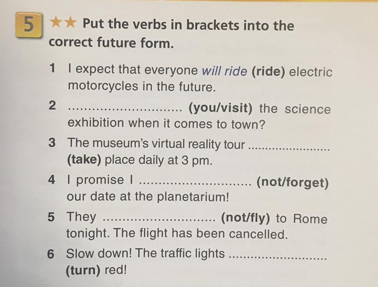 Ответ: 2) Will you visit 3) will take 4) will not forget 5) will not fly 6) will turn