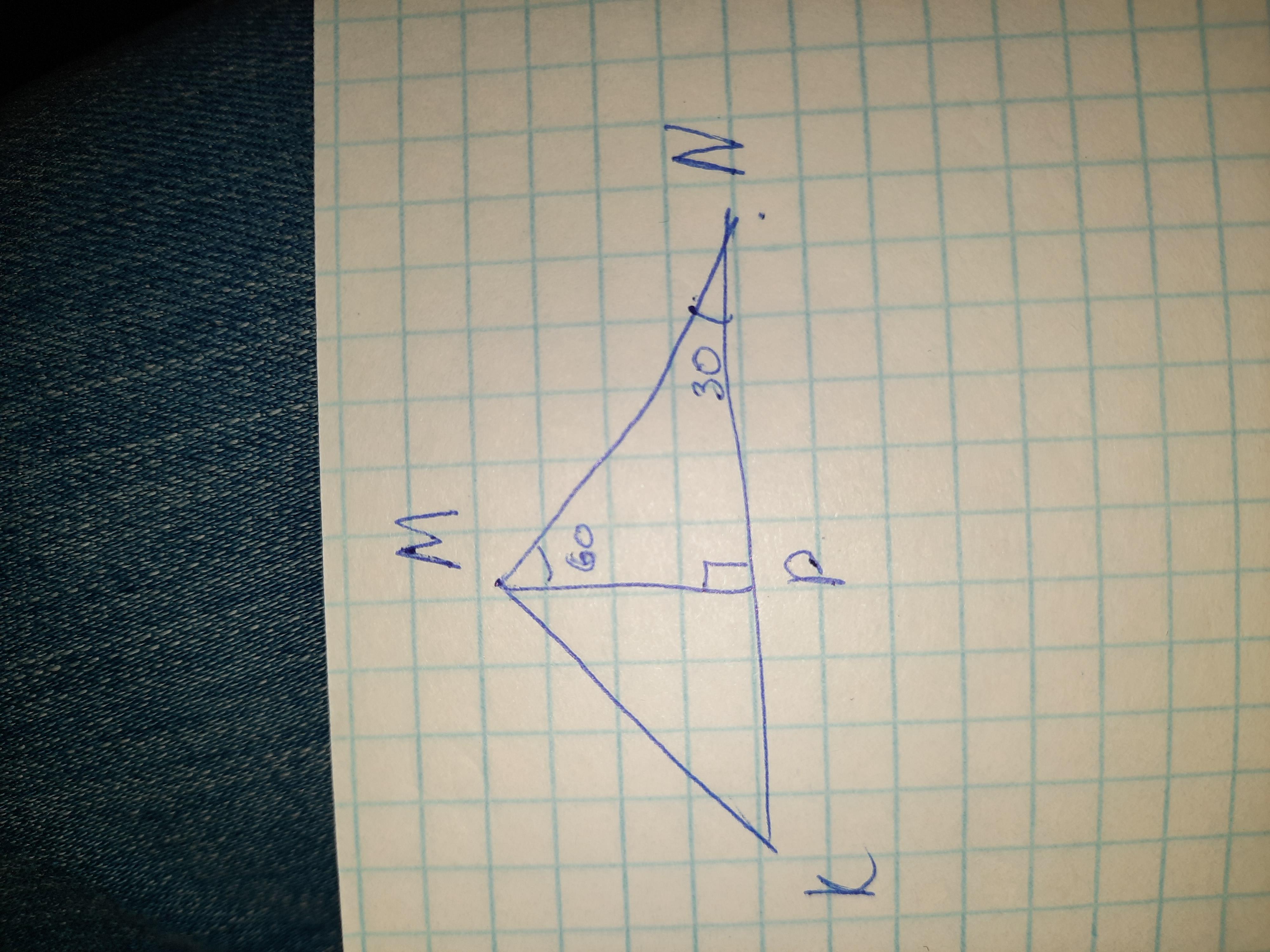 Возможно вы имеете ввиду угол NMP , тогда угол 60. Так как сумма острых углов в прямоугольном треугольнике равна 90.