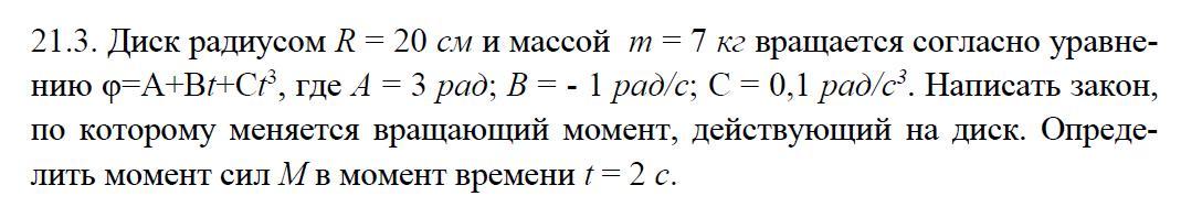М=J*ерs, ускорение eps=d²ф/dt²= 0+0+6Ct= 6Ct, момент инерции диска J=mr²/2=7*0.2²/2= 0.14 кгм², 6С=0.6 р/с² ,тогда