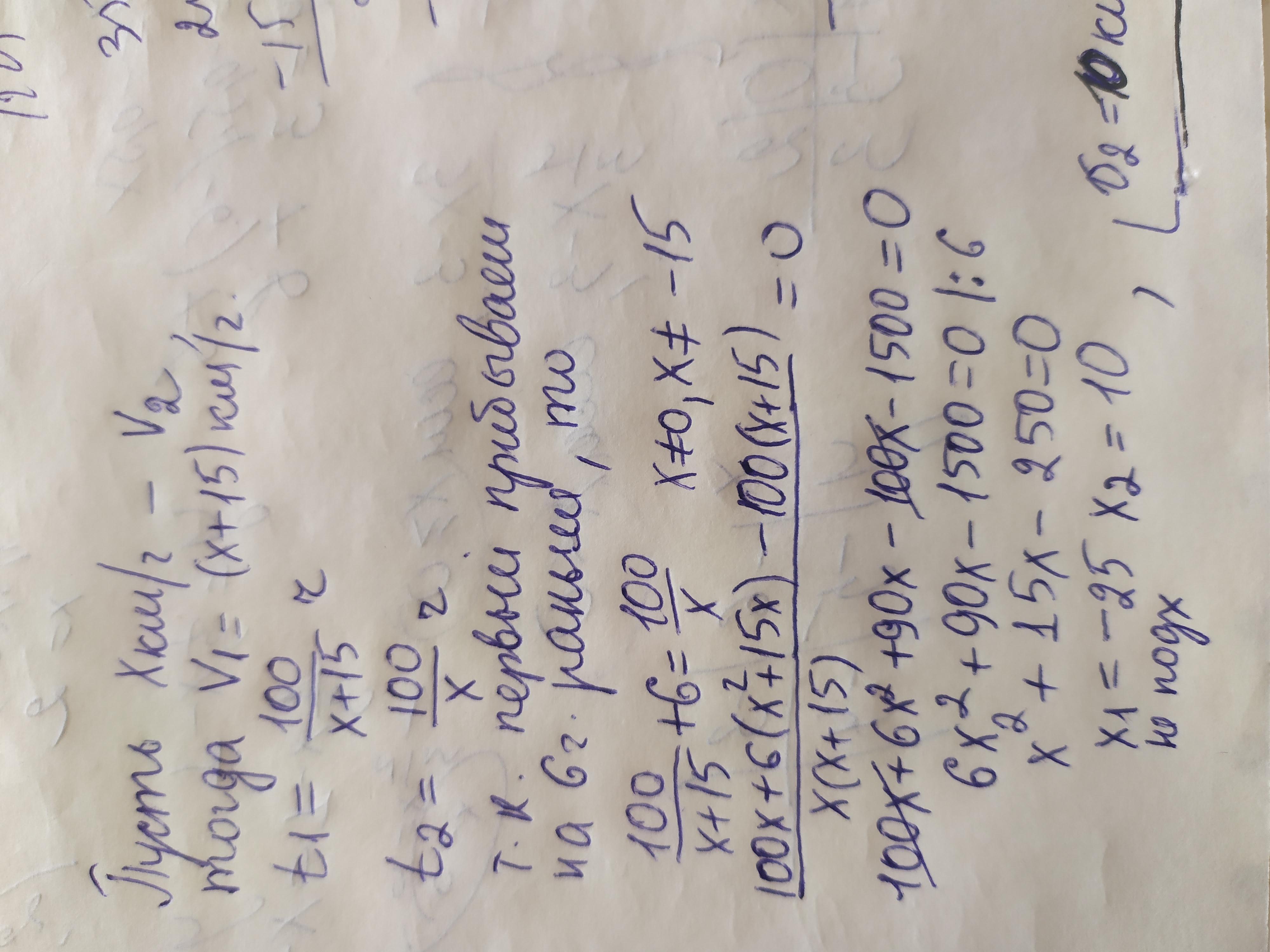 Два велосипедиста одновременно отправляются в 100 километровый пробег первый едет со скоростью на 15км/ч большей, чем второй и прибывает к финишу на 6 часов раньше второго найдите скорость велосипедиста пришедшего к финишу вторым ответ дайте в км/ч