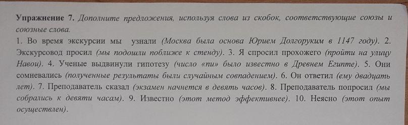 1. Во время экскурсии мы узнали, что Москва была основана Юрием Долгоруким в 1147 году. 2. Экскурсовод просил, чтоб мы подошли поближе к стенду. 3. Я спросил прохожего, чтоб тот прошёл на улицу Новой. 4. Ученые выдвинули гипотезу, что число «пи» было известно в Древнем Египте. 5. Они сомневались, что полученные результаты были случайным совпадением. 6. Он ответил, что ему двадцать лет. 7. Преподаватель сказал, что экзамен начнётся в девять часов. 8. Преподаватель попросил, чтоб мы собрались к девяти часам. 9. Известно, что этот метод эффективнее. 10. Неясно, осуществлен ли этот опыт.