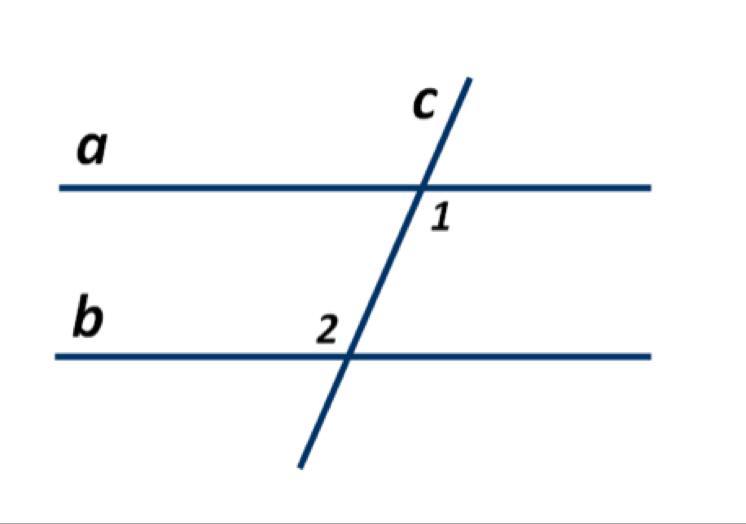 Углы 1 и 2 - накрест лежащие, а они равны только при том случае, если прямые параллельны (а // b) и имеется секущая (с)