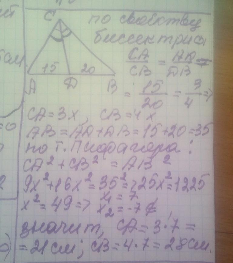 Бісектриса прямокутного трикутника ділить гіпотенузу на відрізки 15 см і 20 см. Знайдіть периметр трикутника.