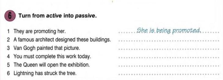 Turn from active into passive. Sha ie.being promosed . 1 They are promoting her. 2 A famous architect designed these buildings 3 Van Gogh painfed that picture. 4 You must complete this work today. 5 The Queen will open the exhibition. 6 Lightning has struck the tree. өз