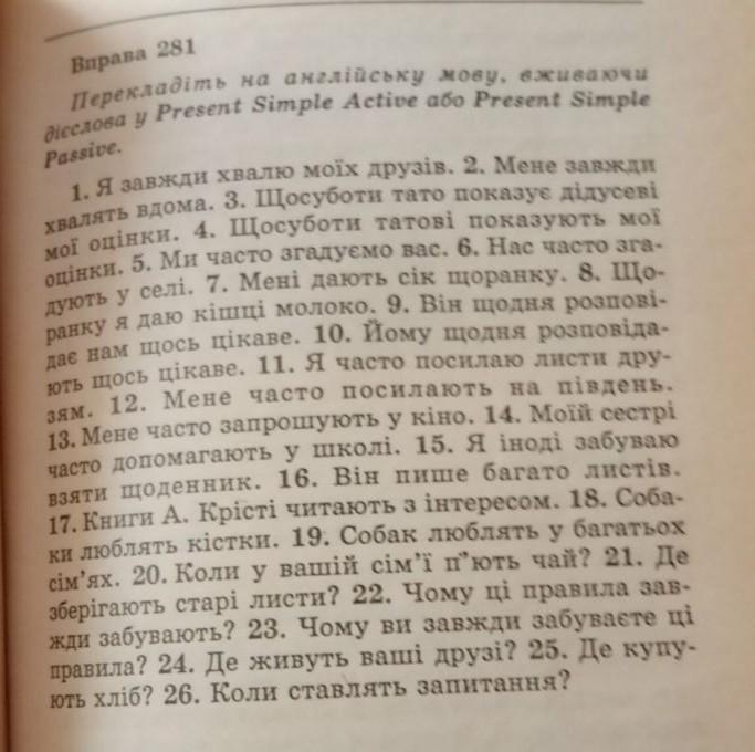 1. I always praise my friends. 2. I am always praised at home. 3. My father shows my grades to my grandfather every Saturday. 4. My father is shown my grades every Saturday. 5. We often remember you. 6. We are often remembered in the village. 7. I am given a juice every morning. 8. I give my cat milk every morning. 9. He tells us something interesting every day. 10. He is told something interesting every day. 11. I often send letters to my friends. 12. I am always sent to the south. 13. I am often invited to the movies. 14. My sister is often helped in school. 15. I sometimes forget to take my diary. 16. He writes many letters. 17. A. Christie's books are read with interest. 18. Dogs like bones. 19. Dogs are lived in many families. 20. When the tea is drunk in your family? 21. Where are old letters kept? 22. Why are these rules always forgotten? 23. Why do you always forget these rules? 24. Where do your friends live? 25. Where is bread bought? 26. When are questions asked?