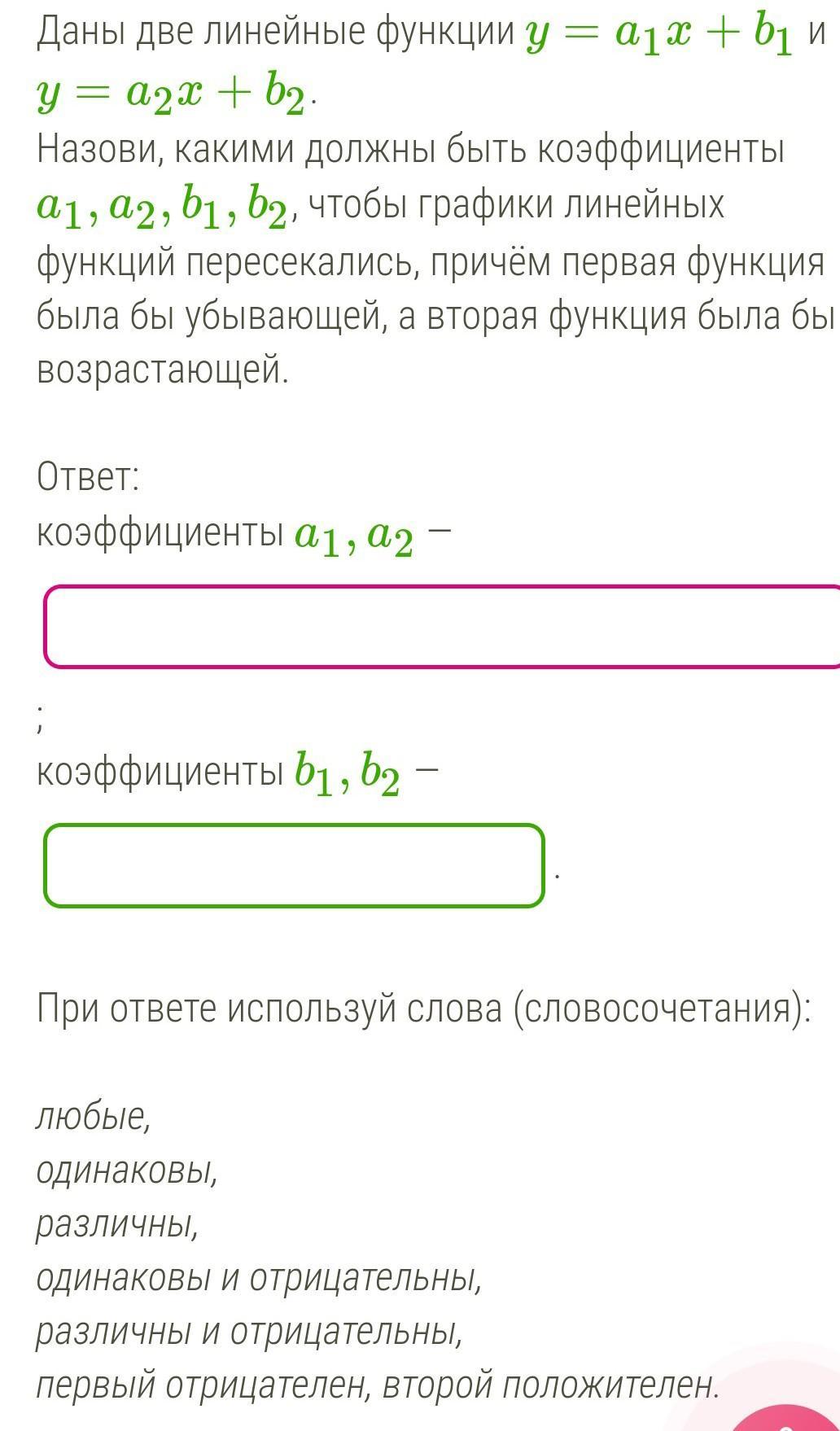 Назови, какими должны быть коэффициенты a1,a2,b1,b2, чтобы графики линейных функций пересекались, причём первая функция была бы убывающей, а вторая функция была бы возрастающей.