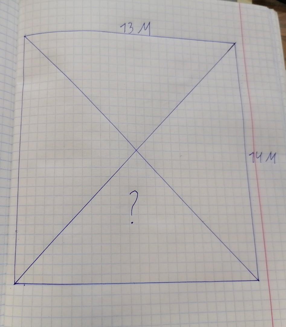 S=1/2ah, где a=13 м - основание, h=14/2 = 7 м. (Диагонали в прямоугольнике точкой пересечения делятся пополам).