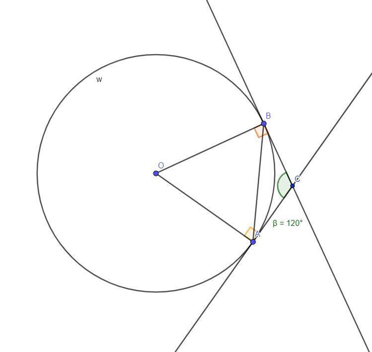 ω (O), OB = OA = R, хорда AB = R, BC и AC - касат.; BC ∩ AC = C